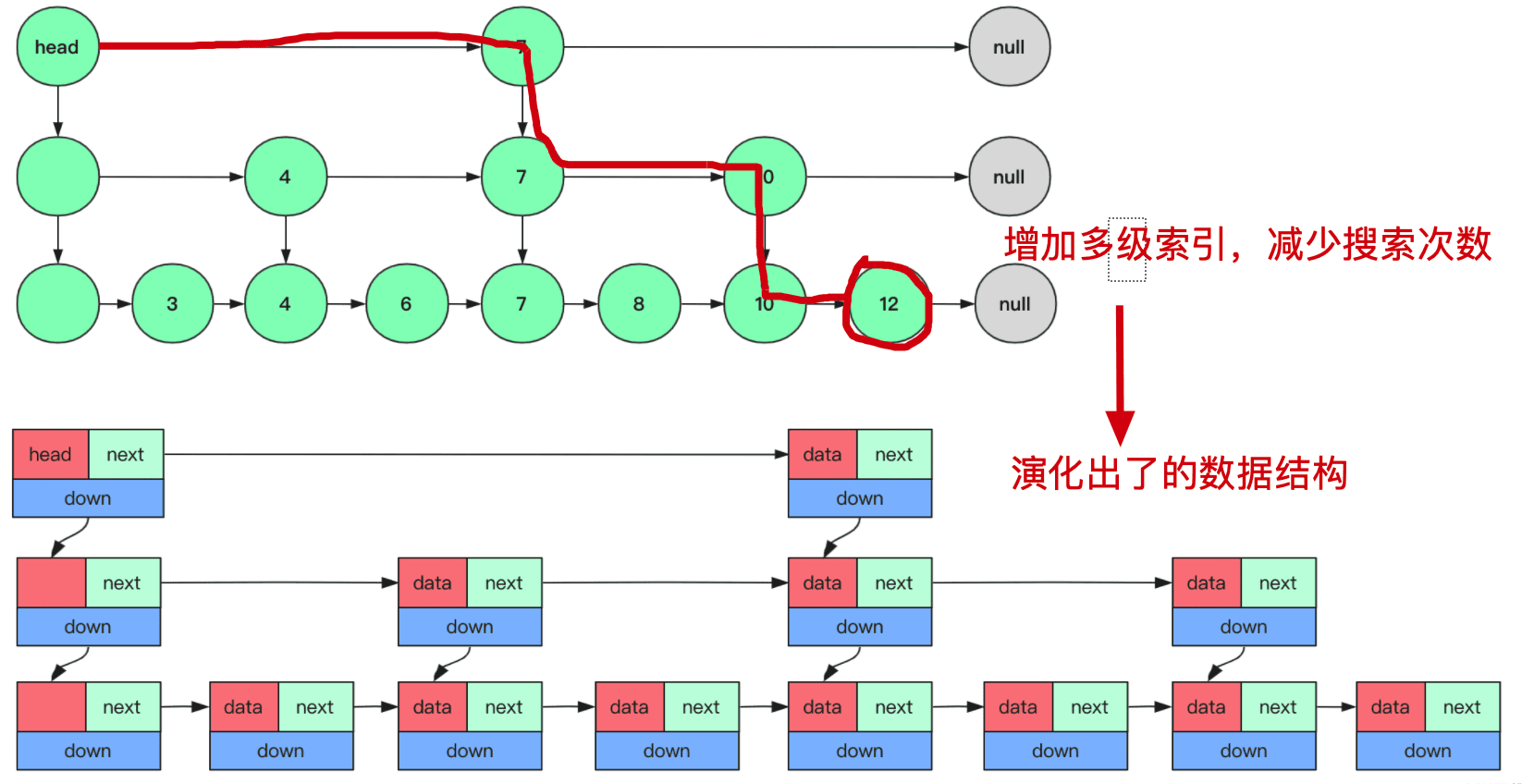 对于于一个单链表来讲,即便链表中存储的数据是有序的,如果我们要想在其中查找某个数据,也只能从头到尾遍历链表。这样查找效率就会很低,时间复杂度会很高,是 O(n)。比如查找12,需要7次查找