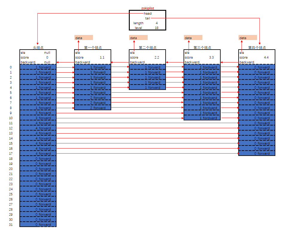 ele字段,持有数据,是sds类型score字段, 其标示着结点的得分, 结点之间凭借得分来判断先后顺序, 跳跃表中的结点按结点的得分升序排列.backward指针, 这是原版跳跃表中所没有的. 该指针指向结点的前一个紧邻结点.level字段, 用以记录所有结点(除过头节点外);每个结点中最多持有32个zskiplistLevel结构. 实际数量在结点创建时, 按幂次定律随机生成(不超过32). 每个zskiplistLevel中有两个字段forward字段指向比自己得分高的某个结点(不一定是紧邻的), 并且, 若当前zskiplistLevel实例在level[]中的索引为X, 则其forward字段指向的结点, 其level[]字段的容量至少是X+1. 这也是上图中, 为什么forward指针总是画的水平的原因.span字段代表forward字段指向的结点, 距离当前结点的距离. 紧邻的两个结点之间的距离定义为1.