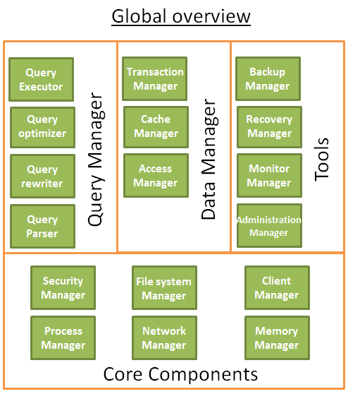 - 监控管理器(Monitor manager):用于记录数据库活动信息和提供监控数据库的工具。