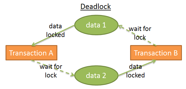 哈希表可以看作是个图表(见上文图),图中出现循环就说明有死锁。由于检查循环是昂贵的(所有锁组成的图表是很庞大的),经常会通过简单的途径解决:使用超时设定。如果一个锁在超时时间内没有加上,那事务就进入死锁状态。