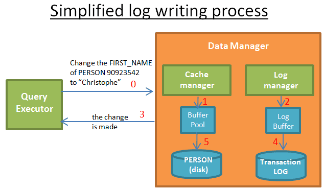 这个工作由日志管理器完成。简单的理解就是,日志管理器处于缓存管理器(cache manager)和数据访问管理器(data access manager,负责把数据写入磁盘)之间,每个 update / delete / create / commit / rollback 操作在写入磁盘之前先写入事务日志。这个过程并简单,原因在于如何找到写日志的同时保持良好的性能的方法,如果事务日志写得太慢,整体都会慢下来。