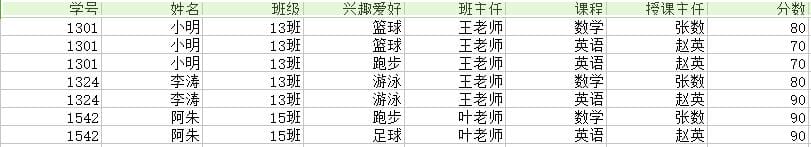 - 元组(tuple):每一个行,如第二行 (1301,小明,13班,篮球,王老师,英语,赵英,70) 就是一个元组
