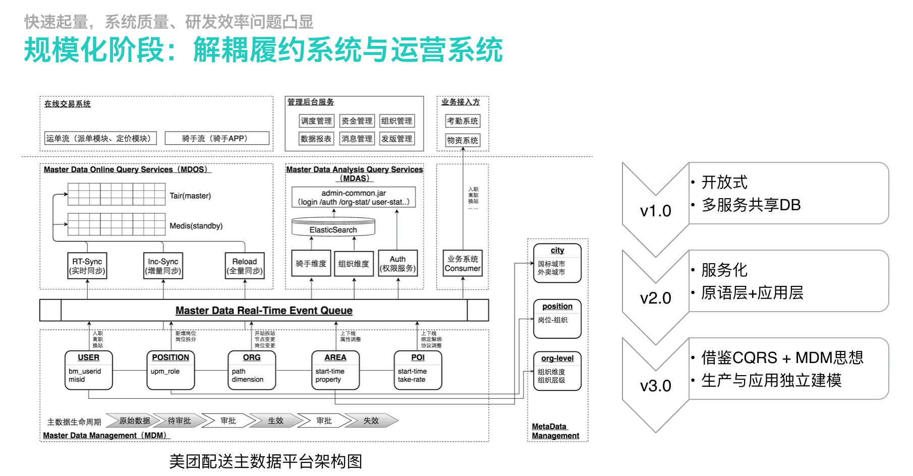 除了履约、运营两个系统的架构设计外,架构设计层面还有一个非常关键的问题,即履约、运营系统的边界与职责如何划分的问题。个人理解这个问题可能是O2O类业务在规模化阶段最关键的架构设计问题,如果不能有效解决将为系统的可用性、扩展性埋下巨大隐患。履约、运营两个方向的业务需求和技术职责有较大差异,且多数数据的生产都在运营系统,最核心最关键的应用在履约系统。虽然各自的领域职责是清晰的,但对于具体的需求边界上不见得简单明了。对此,我们借鉴了MDM思路,提出了主数据平台(图下侧)的概念,重点解决履约系统与运营系统的合作与边界问题。