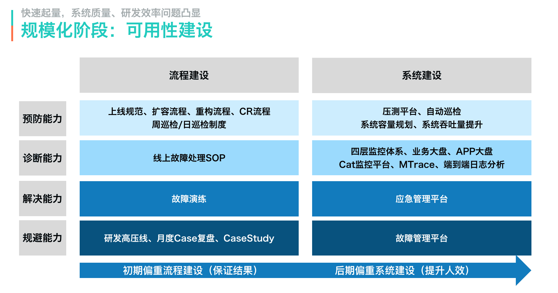 可用性建设是一个长期项目。考虑到ROI,起步阶段重点完成事前的流程建设,即上线规范等一系列线上操作流程,这个工作在早期能够规避80%的线上故障。在流程规范跑通并证实有效之后,再逐步通过系统建设提升人效。
