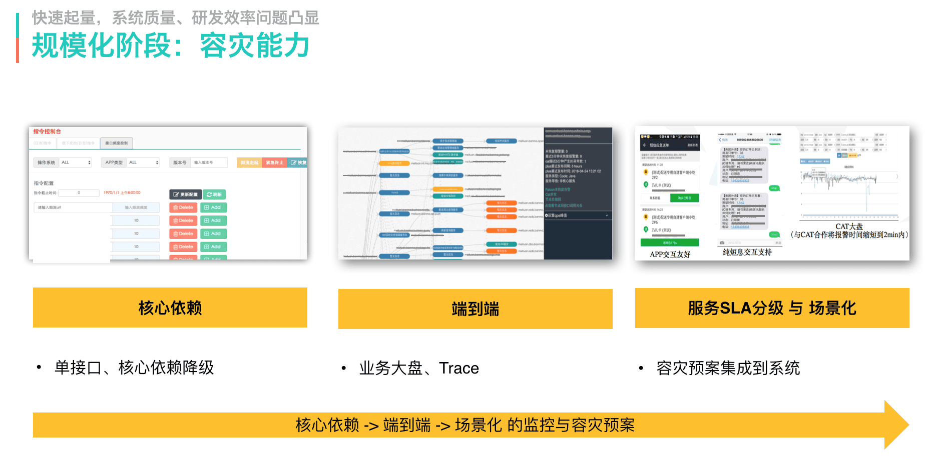 第二阶段我们提出了端到端的容灾能力。首先,我们建设了业务大盘,定义了实时监控核心业务指标(单量、在线骑手数等),通过这些指标能够快速判断系统是不是出了问题。其次,我们在核心指标上扩展了关键维度(城市、App版本、运营商等),以快速评估问题有多大影响。最后,我们通过Trace系统,将服务间的调用关系与链路级成功率可视化展现,具备了快速定位问题的根因在哪的能力。