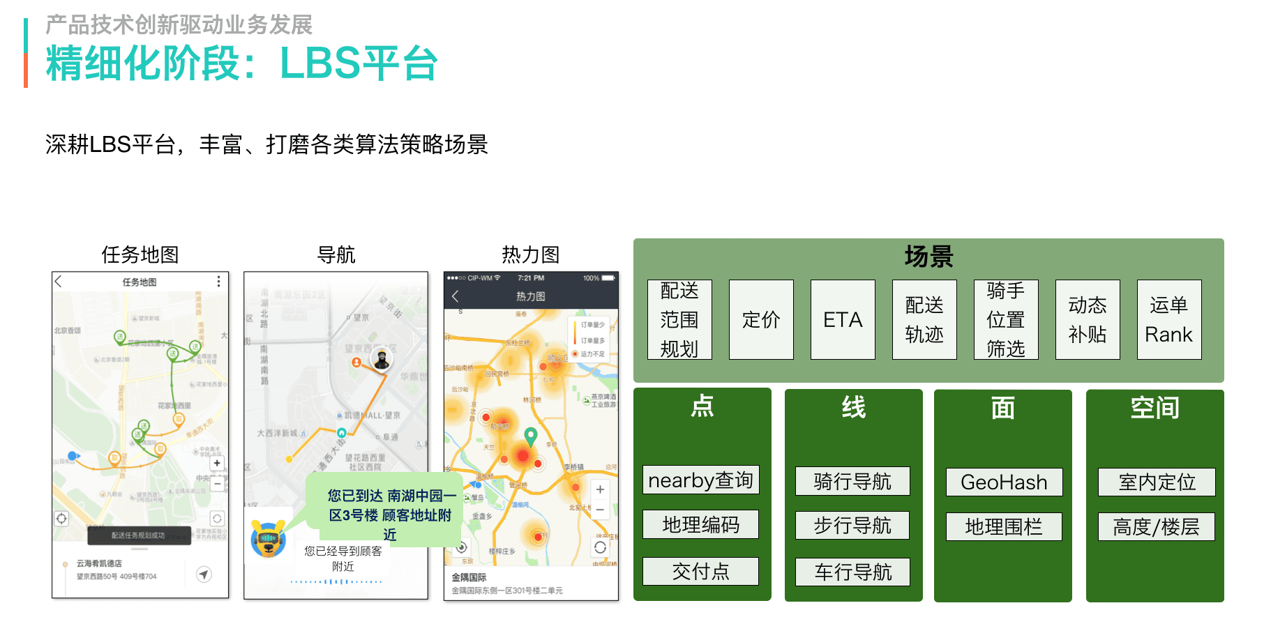 LBS平台早在配送业务的起步阶段就开始实施,随着算法场景的不断发展,LBS不断深化点线面空间能力,为配送调度、时间预估、定价等业务场景提供支撑,打造了任务地图、路径规划、语音导航、热力图等产品。