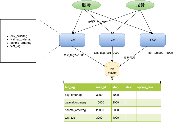 - 每个biz-tag都有消费速度监控,通常推荐segment长度设置为服务高峰期发号QPS的600倍(10分钟),这样即使DB宕机,Leaf仍能持续发号10-20分钟不受影响。
