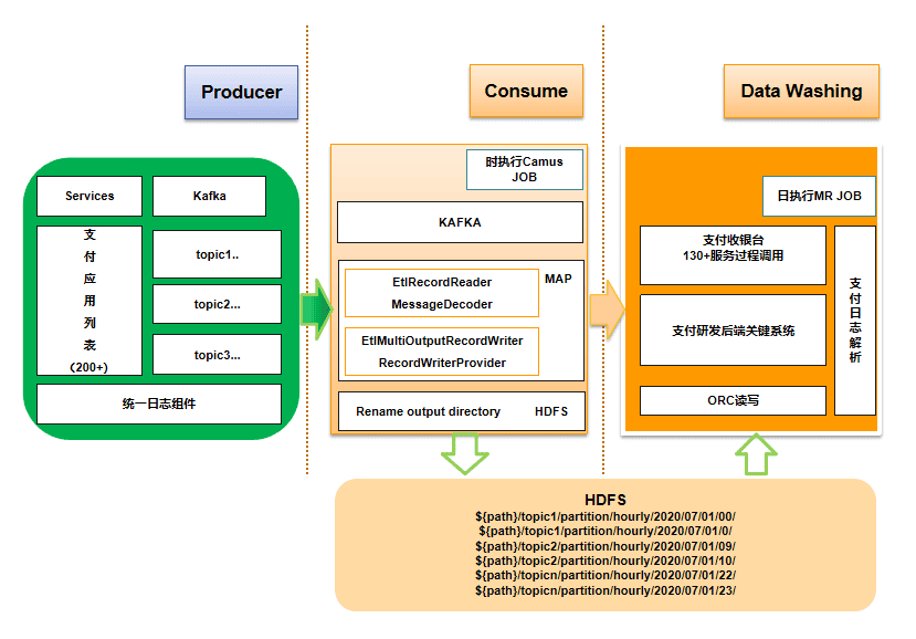 支付数据侧根据研发、产品的需求对不同类型日志进行分级,对于不同类别的日志设置不同的存储周期,主要划分为:研发排障日志、审计日志、数据分析日志等;同时在camus将日志写入hdfs时,由于按照业务分区进行落地,导致生成了大量小文件,需要对这些小文件进行合并并且设置TTL,避免对hadoop namenode产生较大的影响。