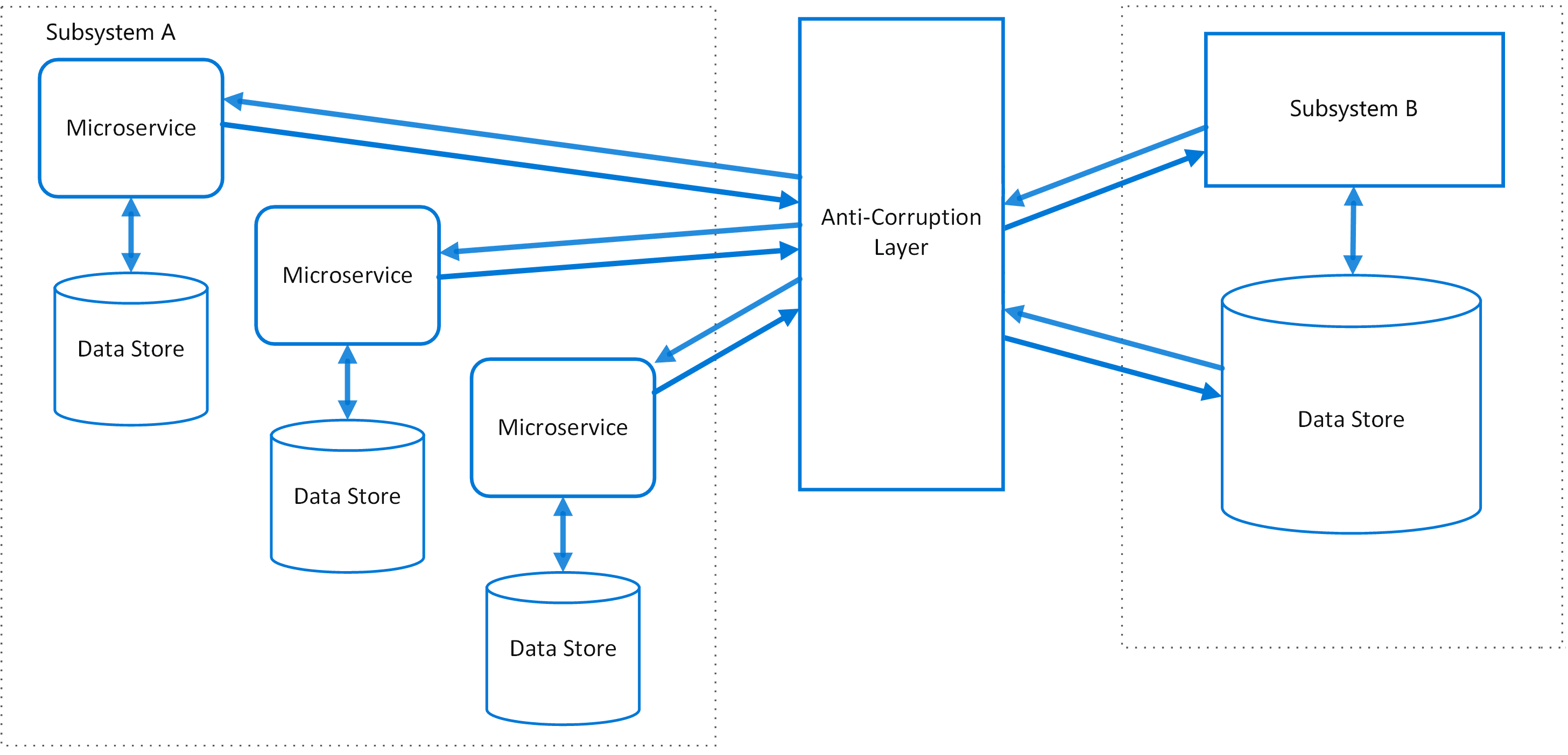 使用一层反腐层来作为新老系统通讯的中间人。这样新系统可以完全使用新的通讯方式和架构方式,老的系统又不用进行特别改造可以暂时保留,等老系统不用之后可以废弃这个反腐层。这种模式适合新老系统迁移的过渡方案,不属于永久使用的架构设计模式。