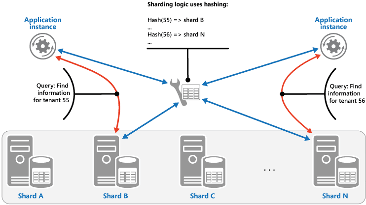 - 需要根据数据分布、压力情况、业务逻辑确定分片的方式,按照条件还是范围还是哈希等等(三个图展示了三种策略)。