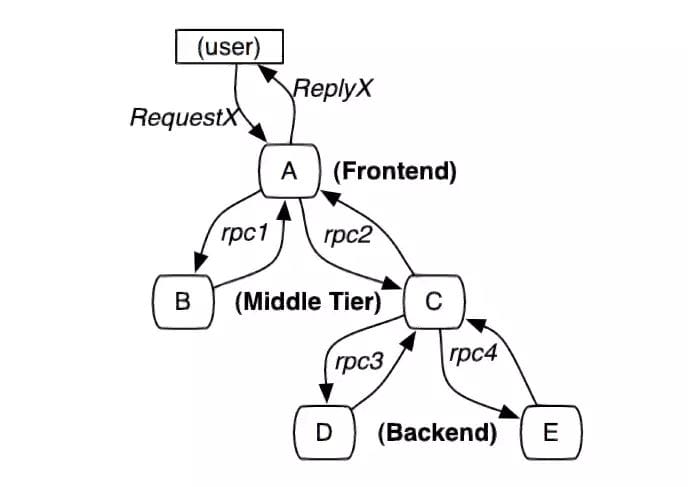市面上的同类型框架几乎都是以Google Dapper论文为基础进行实现,整体大同小异,都是通过一个分布式全局唯一的id(即traceId),将分布在各个服务节点上的同一次请求串联起来,还原调用关系、追踪系统问题、分析调用数据、统计系统指标。分布式会话跟踪,是一种会话级别的追踪能力,如下图2所示,单个分布式请求被还原成一条调用链路,从客户端发起请求抵达系统的边界开始,记录请求流经的每一个服务,直到向客户端返回响应为止。
