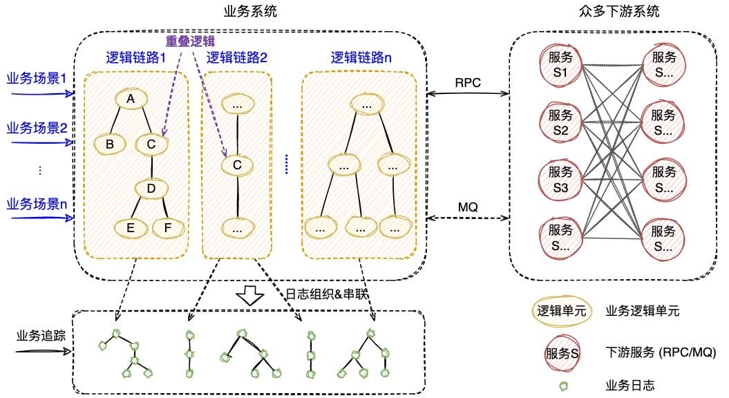- 日志筛选困难:不同业务场景、业务逻辑之间存在重叠,重叠逻辑打印的业务日志可能相互干扰,难以从中筛选出正确的关联日志。