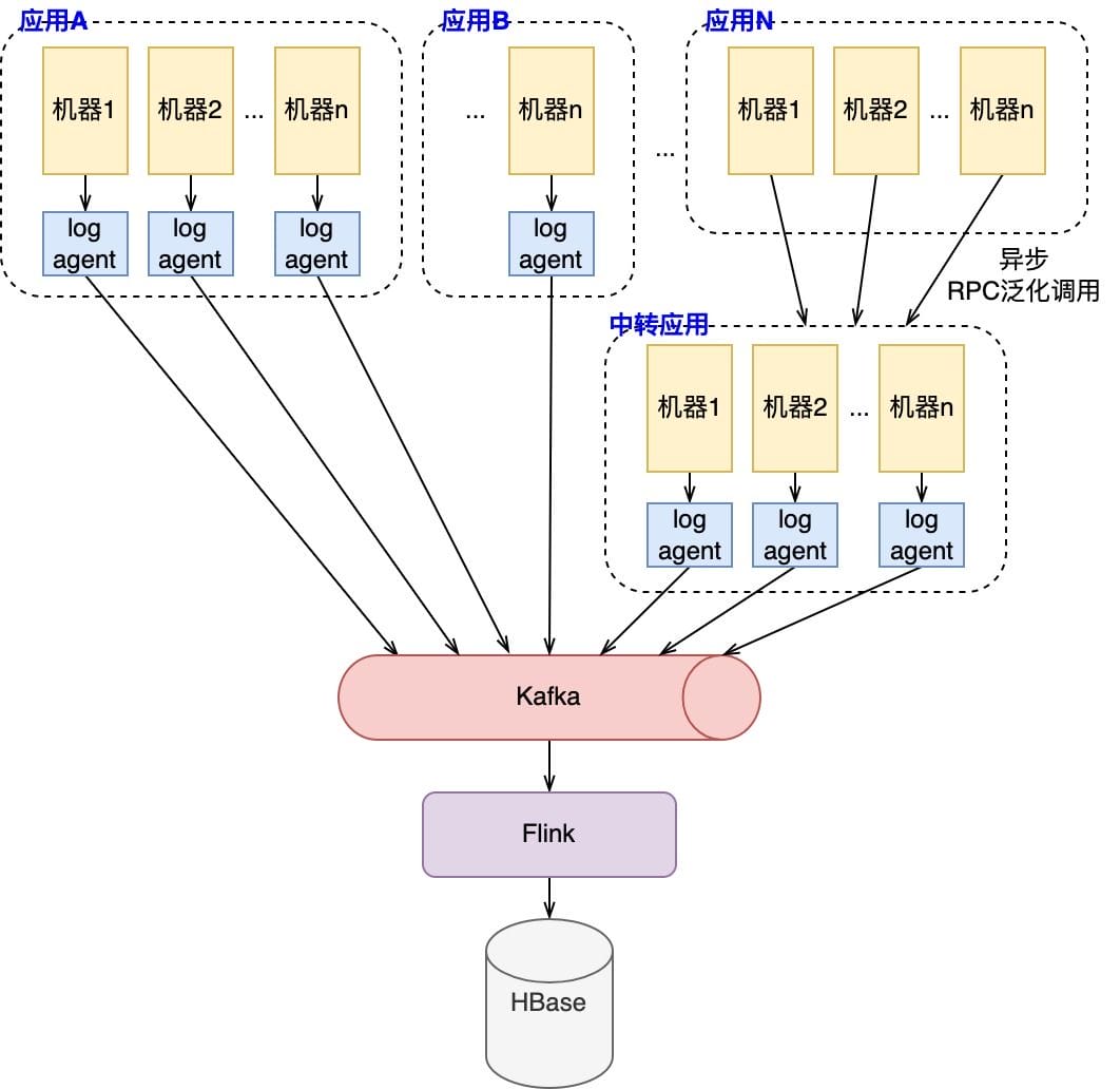 - 日志收集:各应用服务通过机器上部署的log_agent收集异步上报的日志数据,并统一传输至Kafka通道中,此外针对少量不支持log_agent的服务,搭建了如图所示的中转应用。