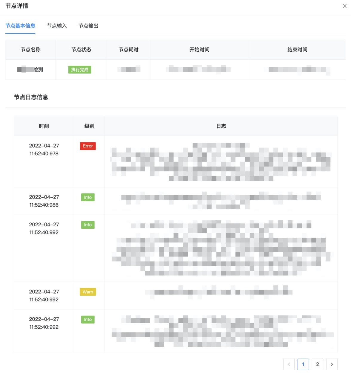【节点详情查询功能】:支持展示任意已执行节点的详情,包括节点输入、输出,以及节点执行过程中的关键业务日志。