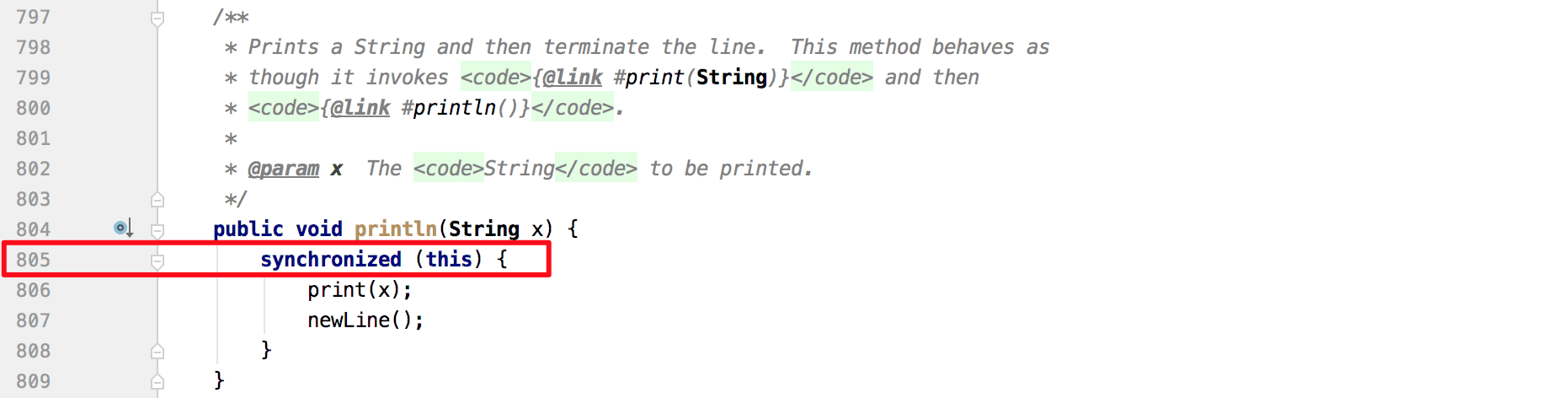 从Blocked线程堆栈着手分析,查看PrintStream相关代码片段如下图5所示,可以看到被阻塞地方有synchronized同步调用,再结合上文发现每两分钟写满一个500MB日志文件的现象,初步怀疑是日志量过大导致了线程阻塞。
