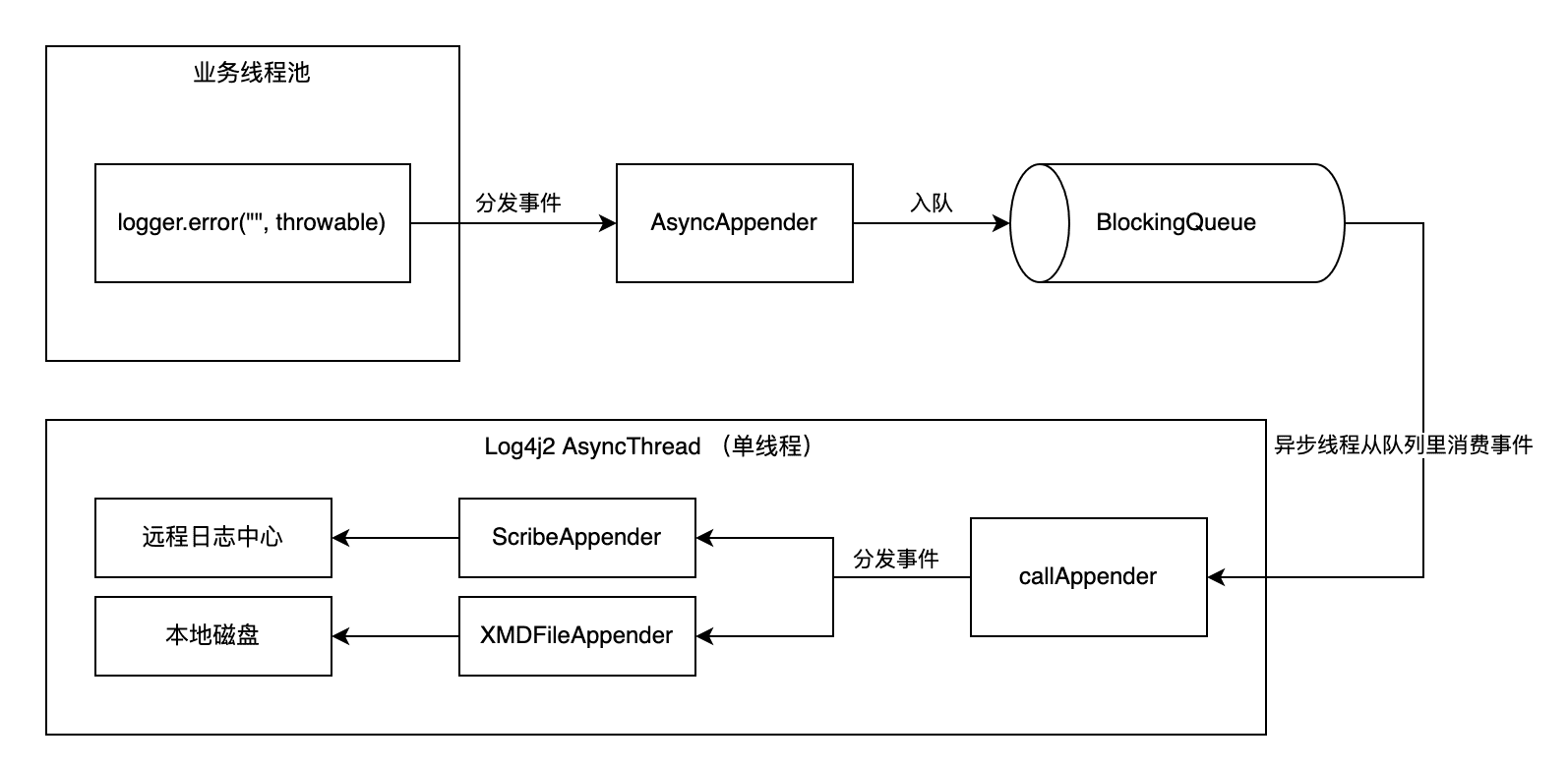 }AsyncAppender顾名思义是个异步Appender,采用异步方式处理日志,在其内部维护了一个BlockingQueue队列,每次处理日志时,都先尝试把Log4jLogEvent事件存入队列中,然后交由后台线程从队列中取出事件并处理(把日志交由AsyncAppender所关联的Appender处理),但队列长度总是有限的,且队列默认大小是128,如果日志量过大或日志异步线程处理不及时,就很可能导致日志队列被打满。