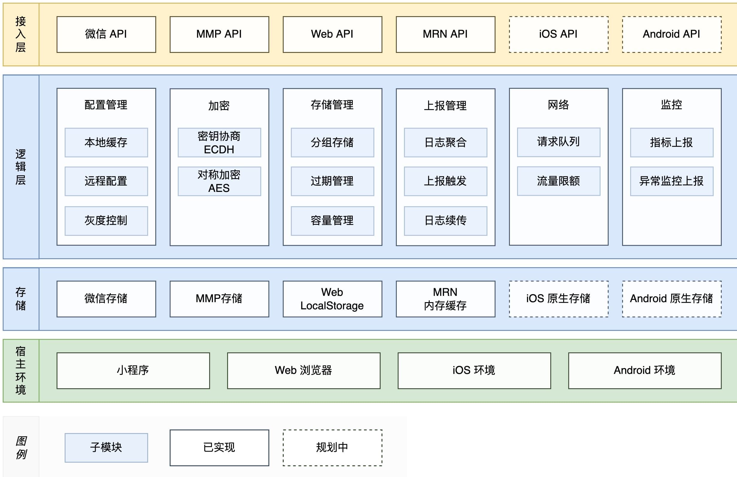 采集端SDK用于端侧日志收集,需要在多种终端环境落地,但是由于端和平台较多、技术栈和运行环境也不一致,多端开发和维护成本会比较高。因此,我们设计了一套核心逻辑复用的通用采集端架构,具体的平台依赖代码则单独进行适配。我们目前上线了微信、MMP、Web、MRN 端侧,逻辑层代码做到了完全复用。采集端架构设计图如下:
