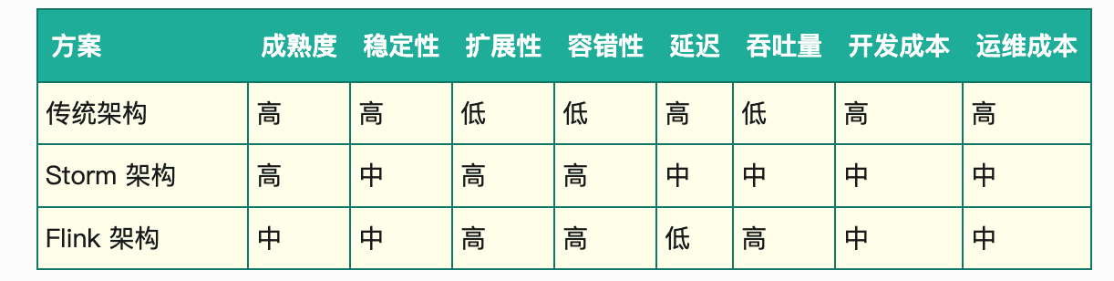在数据处理框架的技术选型上,我们先后考虑了三种方案,分别是传统架构(Java 应用)、Storm 架构、Flink 架构,这三种方案在不同维度的对比数据如下: