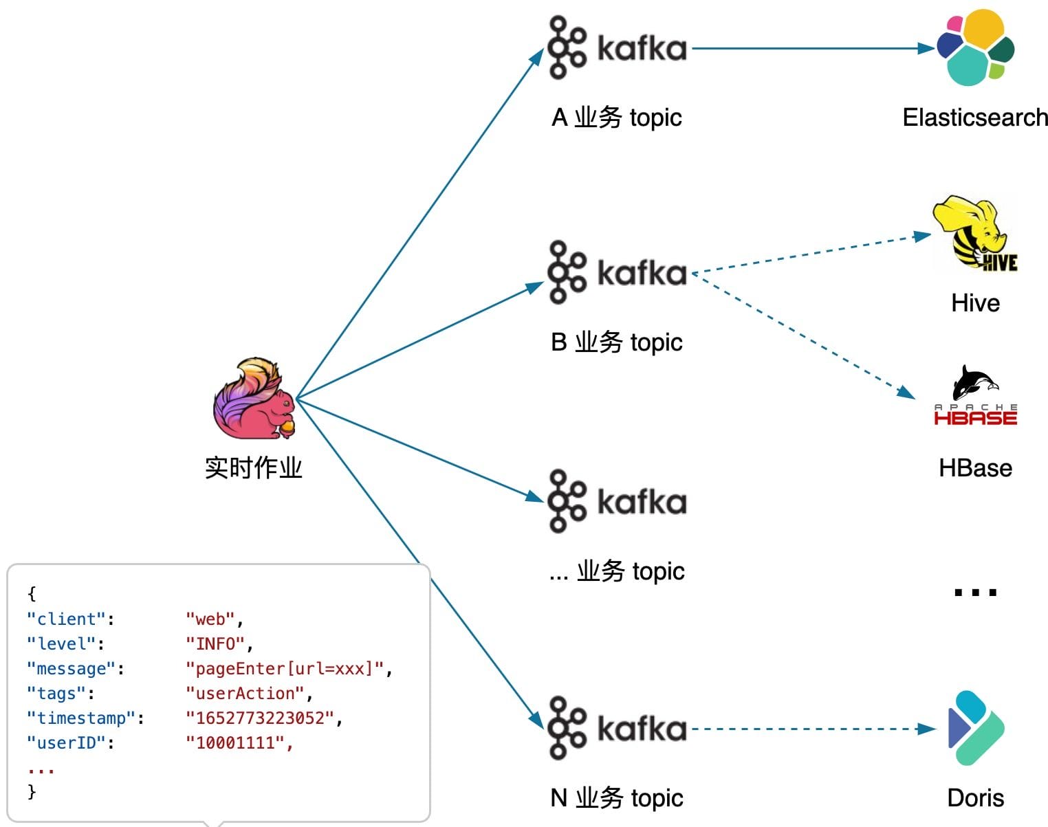 - 指标聚合统计&告警:实时日志也是一种实时的数据流,可以作为指标数据上报的载体,如果把日志数据对接到数据统计平台就能实现指标监控和告警了。
