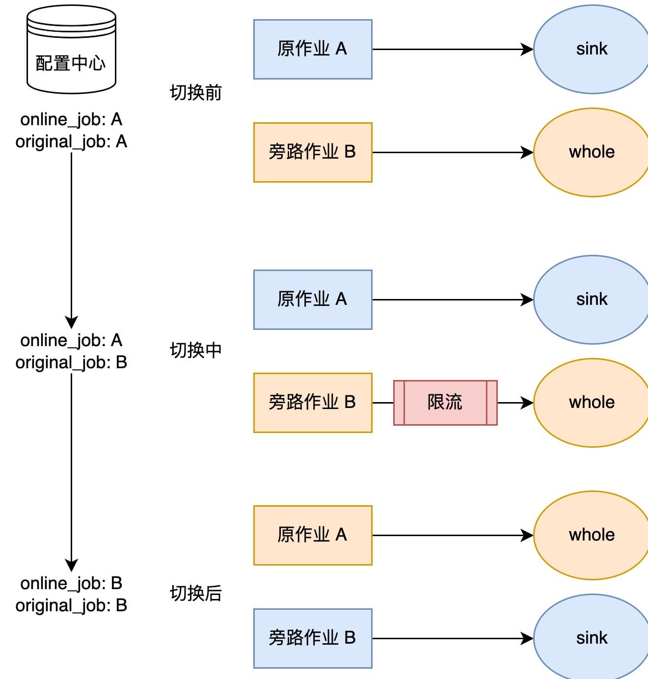 目前美团已有的实时作业蓝绿部署方案各不相同,由于 Logan 实时日志接入业务系统较多,且数据量较大,经过综合考量后,我们决定自己实现一套适合当前系统的蓝绿部署方案。为了保证系统的稳定性,在作业运行过程中,启动另外一个相同的作业,当新作业运行没有问题后,再完成新老作业切换。蓝绿发布流程图如下: