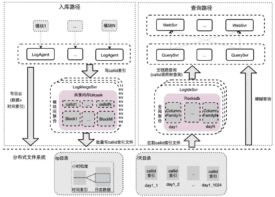 - LogMergeSvr:对一段时间内的 callid 索引进行模块间聚集,批量写分布式文件系统;
