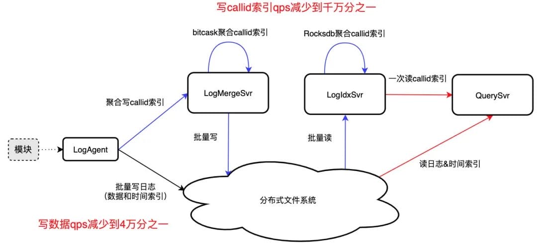 - 模块内聚合:LogAgent 聚合模块内 callid 索引,批量写入 LogMergeSvr,qps 约减少到万分之一;