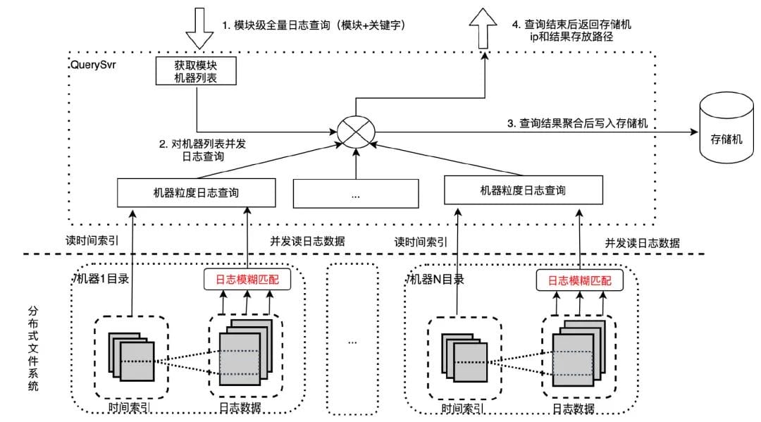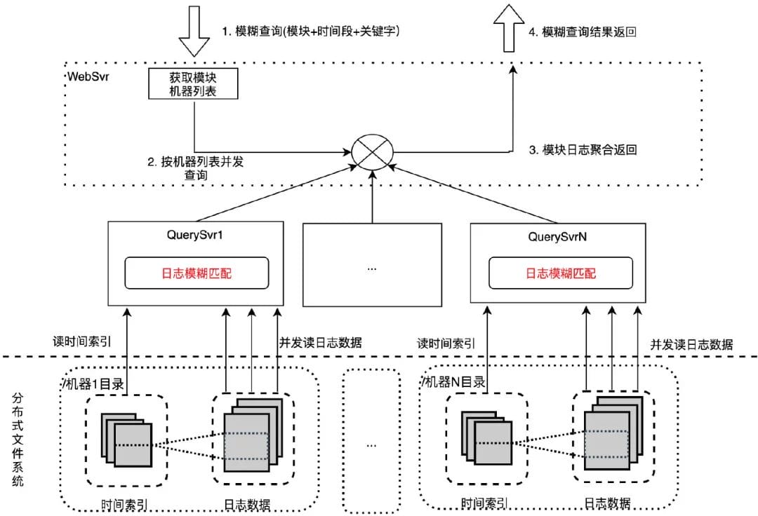 - 原始版本:并发检索 WebSvr 接收用户模糊查询请求(模块+时间段+关键字),依据模块获取机器列表后,按机器列表并发请求到多台 QuerySvr 执行机器粒度日志查询:通过机器 IP 找到机器日志目录,根据时间段拉取时间索引文件,确定日志数据范围,并发拉取日志到本机用关键字做模糊匹配。最终将匹配后的日志返回给 WebSvr 聚合展示给用户。
