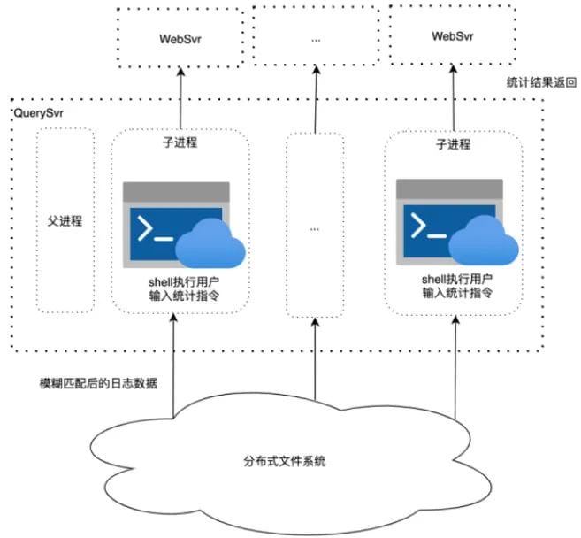 - 支持统计指令 用户不仅需要对日志做模糊匹配,还需要对匹配后的日志执行 awk/uniq/sort 等统计指令,其中涉及到指令相互嵌套执行,非常复杂,难以调用相关库实现。我们通过子进程调用系统 shell 支持这一需求。QuerySvr 从分布式文件系统拉取日志数据到本机后,子进程 shell 调用用户传入统计指令处理日志数据,最终结果返回给 WebSvr。子进程处理超时父进程将 kill 掉子进程,防止用户统计任务耗光 QuerySvr 资源。