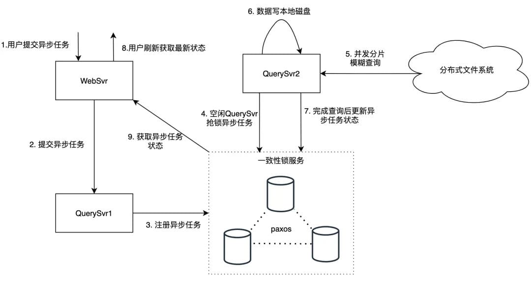 用户异步任务请求通过 WebSvr 转发到 QuerySvr,为避免 QuerySvr 宕机导致异步任务丢失,QuerySvr 会将异步任务写入一致性锁服务中存储,空闲的 QuerySvr 会从一致性锁服务抢锁,抢锁成功后执行该异步任务。