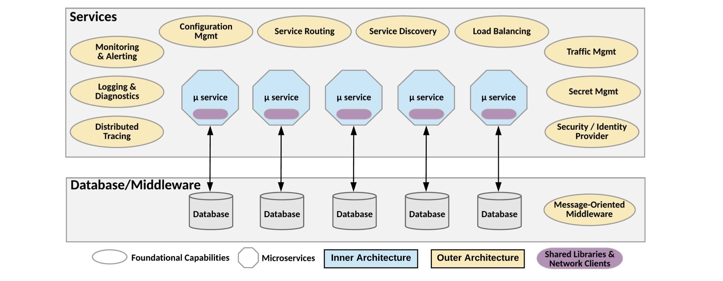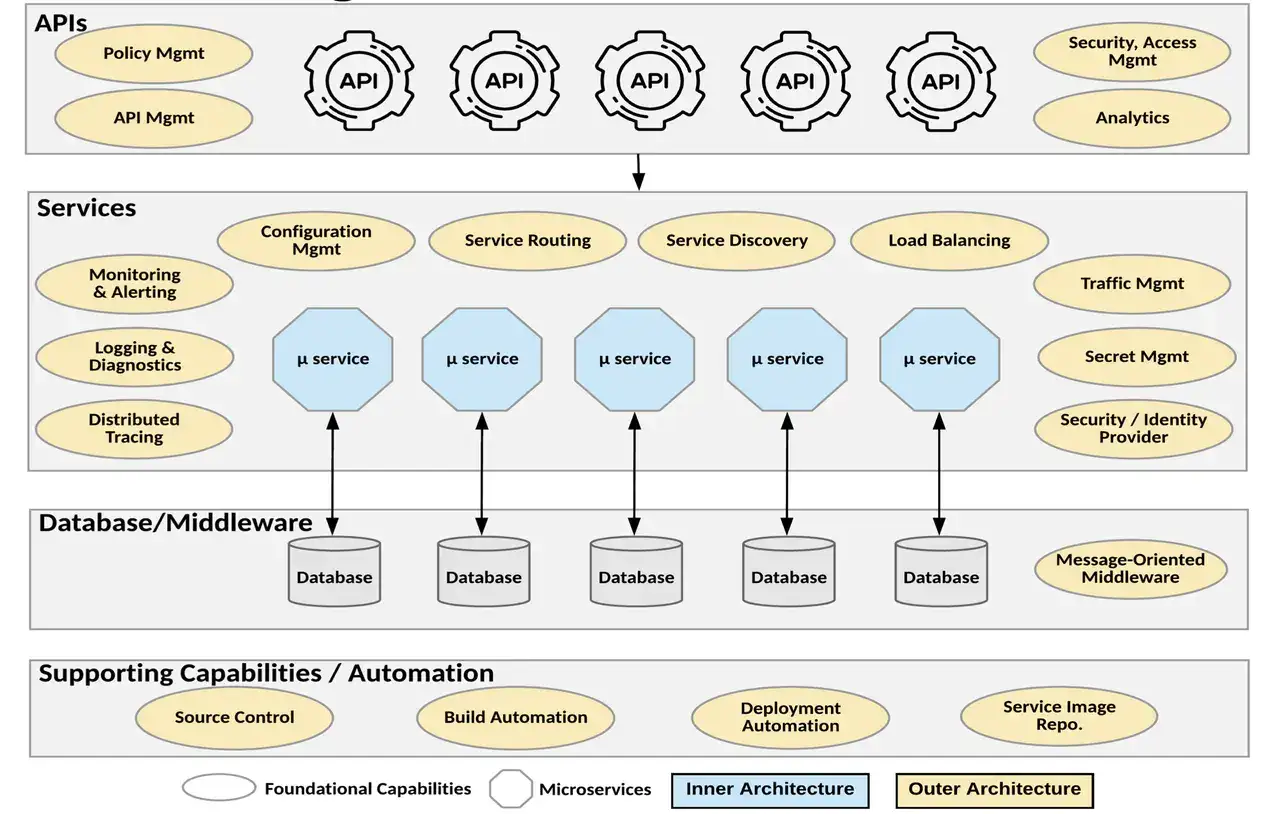 - 外层架构(图上黄色部分),是构建强大微服务架构所需要的各种能力,这里通常有大家熟悉的各种分布式能力;