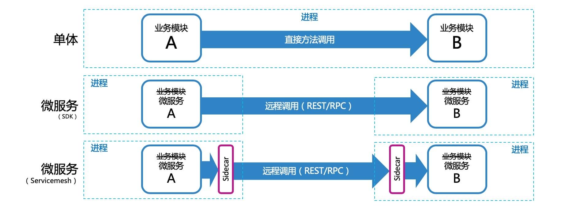 从单体到微服务,直接方法调用被替换为远程调用(REST 或者 RPC),即使采用 Service Mesh 也只是在链路中多增加了 Sidecar 节点,并未改变远程调用的性质: