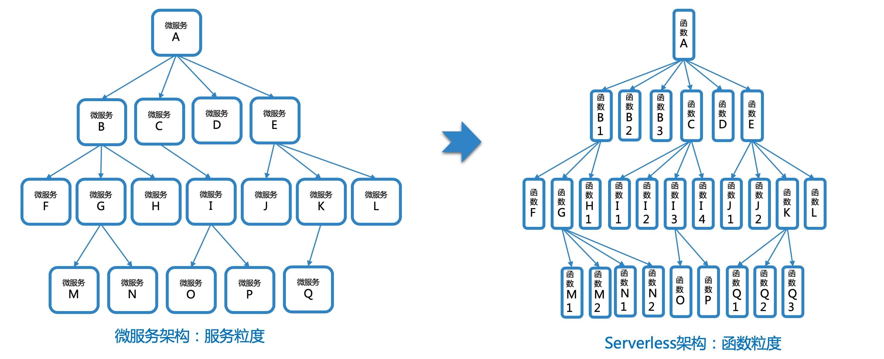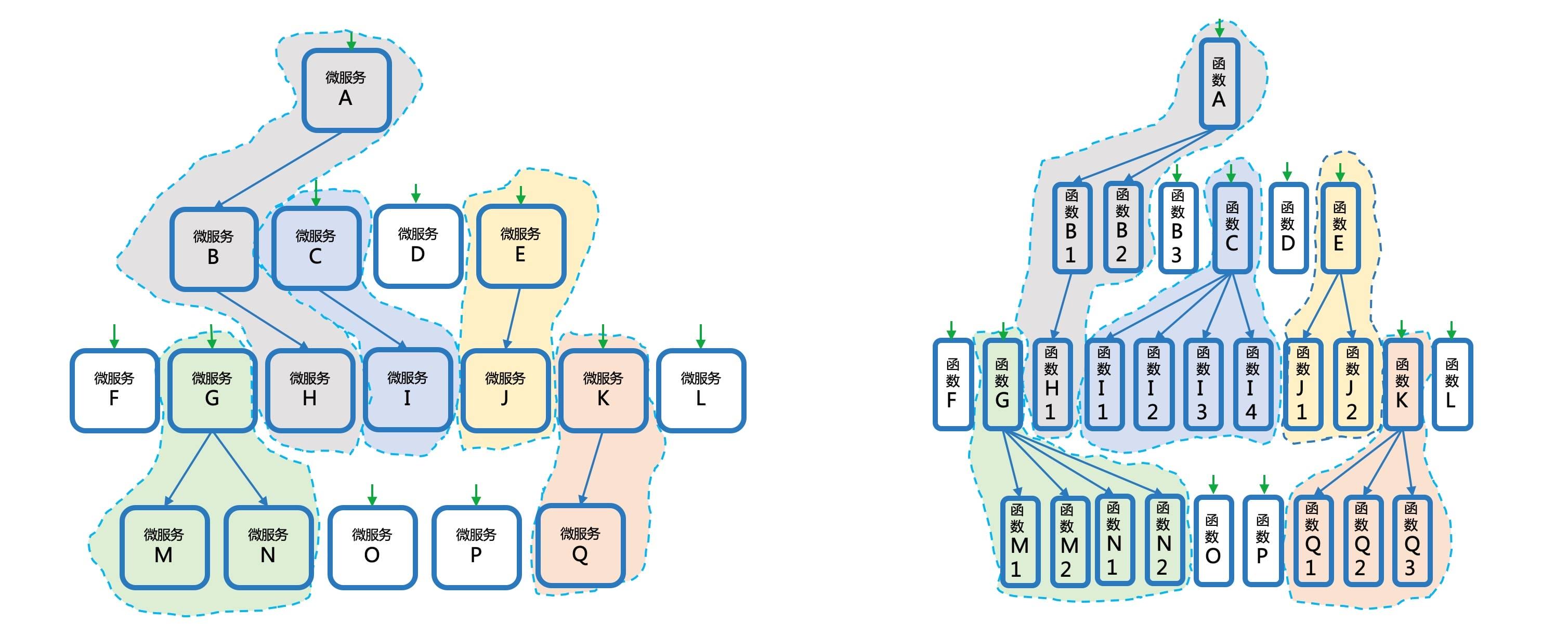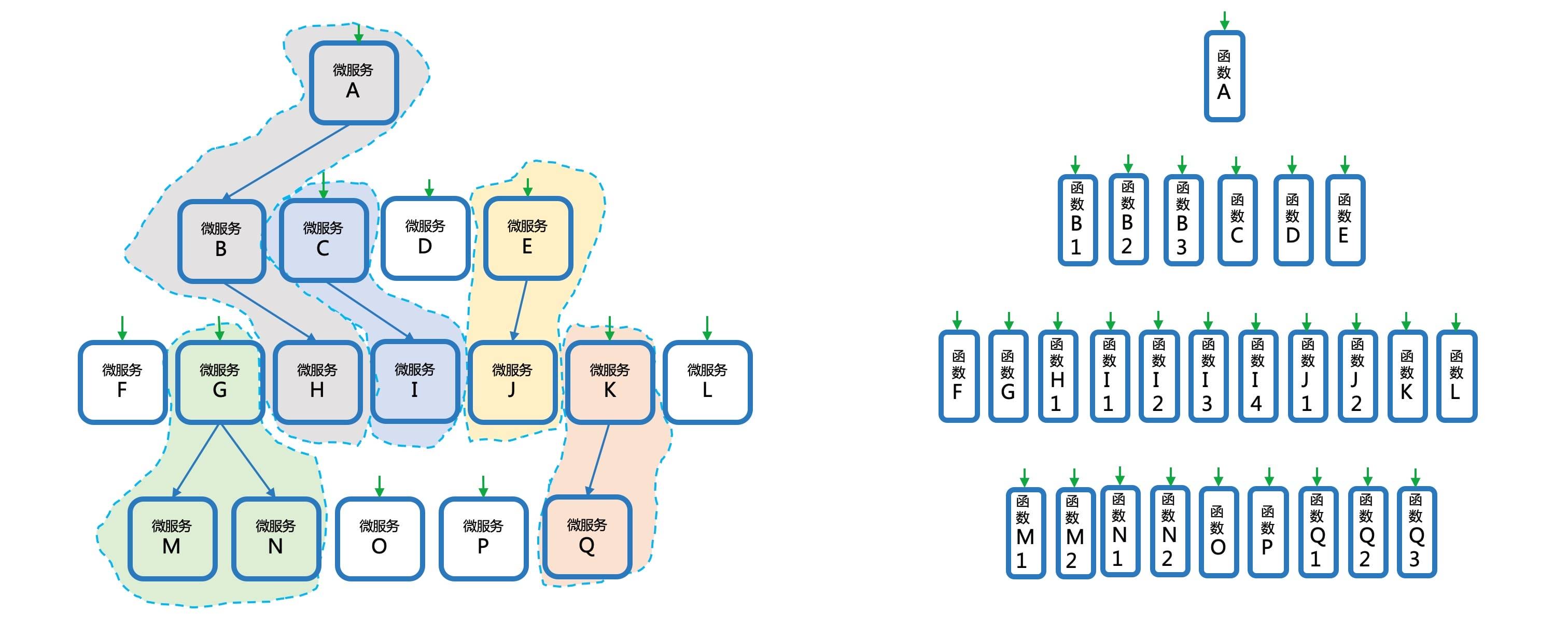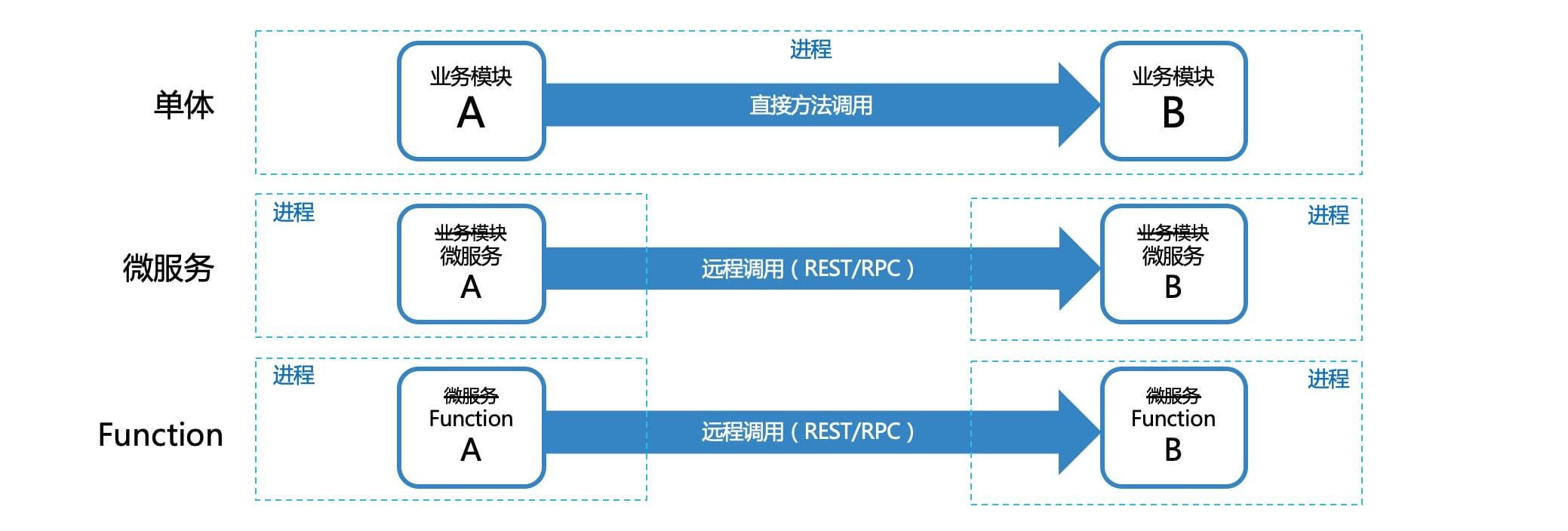在过去几年间,微服务架构成为业界主流,很多公司开始采用微服务,并迁移原有的单体应用迁移到微服务架构。从架构上,微服务和单体最大的变化在于微服务架构下应用的粒度被“拆小”:将所有业务逻辑都在一起的单体应用,按照领域模型拆分为多个内聚而自治的“更小”的应用。而 Function 则在拆分上更进一步,拆分粒度变成了“单个操作”,基于 Function 逐渐演进出现 FaaS 形态和 Serverless 架构。