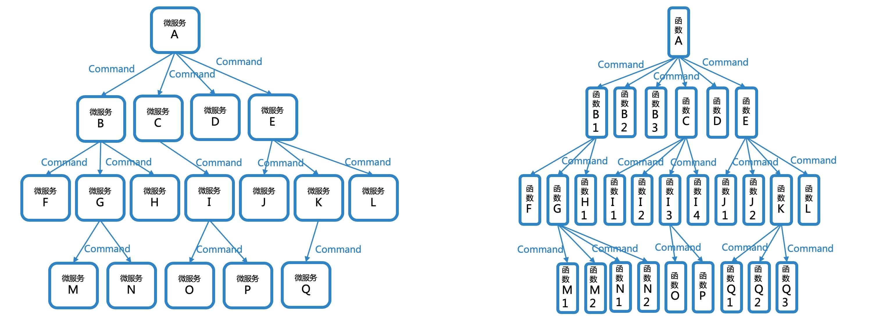 Event 可以解耦生产者和消费者,因此图中的微服务 A 和微服务 C/D/E 之间没有强烈的依赖关系,彼此无需锁定对方的存在。但是 Command 不同,在采用 Command 方式后微服务 A 和下游相关微服务 C/D/E 会形成强依赖,而且这种依赖关系会蔓延,最终导致形成一颗巨大而深层次的依赖树,而 Function 由于粒度更细,问题往往更严重: