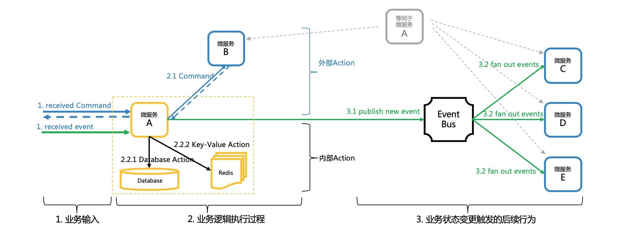 - 业务输入:图上微服务A接收到业务请求的输入(可能是 Command 方式,也可能是 Event 方式)