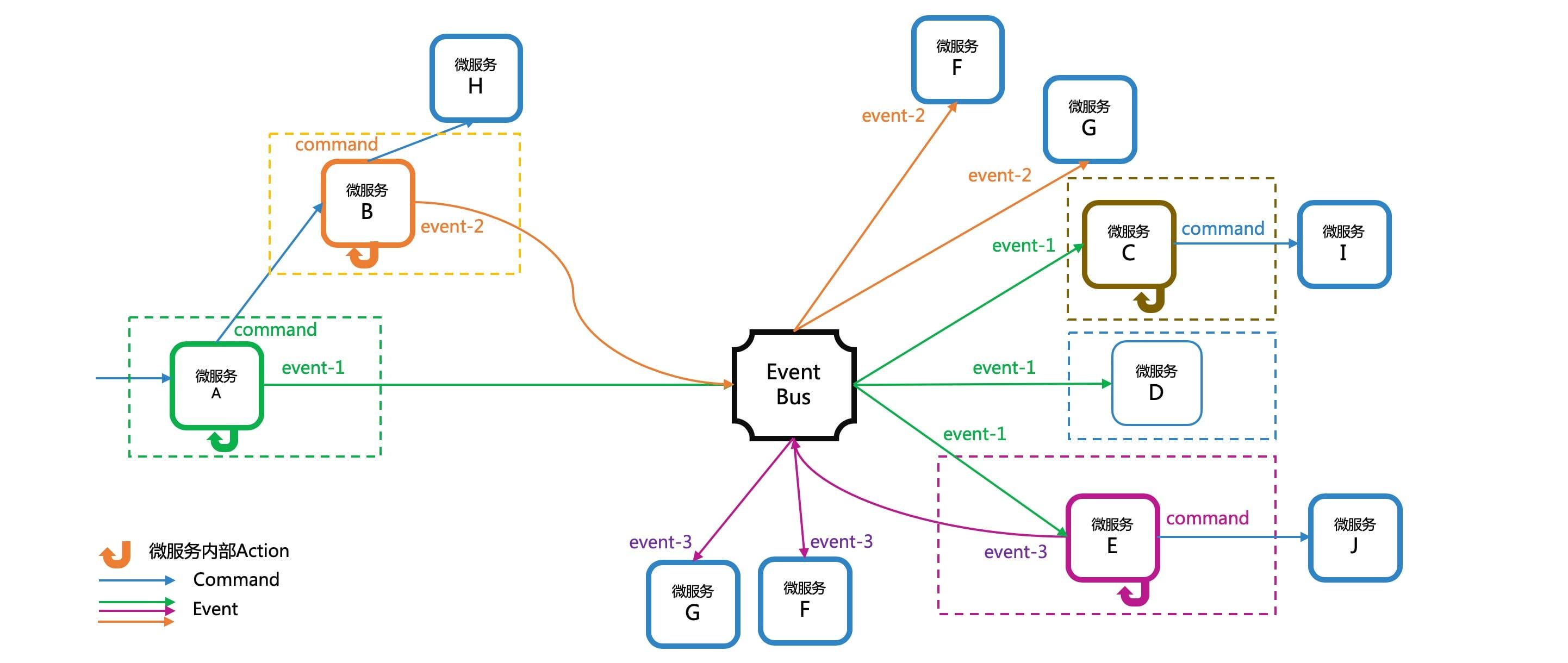 - 事件通过 event bus 分发给对该事件感兴趣的其他微服务:注意这个过程是解耦的,微服务A不清楚也不关心哪些微服务对此事件感兴趣,事件也不需要应答;