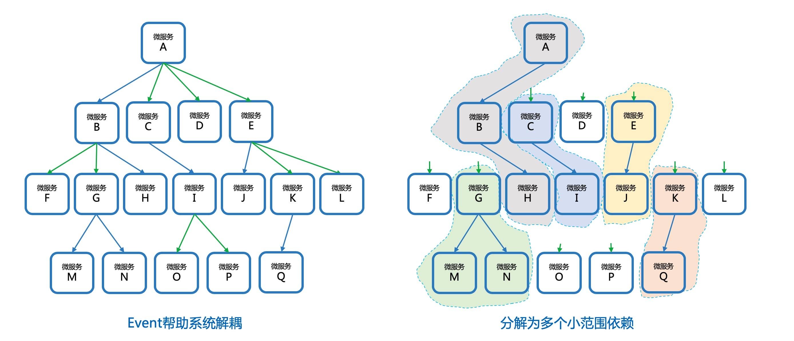 而如果在“状态变更通知”环节引入 Event,则可以解耦微服务和下游被通知的微服务,从而将依赖关系解除,避免无限制的蔓延。如下图所示,左边图形是使用 Event 代替 Command 来进行状态变更通知之后的依赖关系,考虑到 Event 对生产者和消费者的解耦作用,我们“斩断”绿色的 Event 箭头,这样就得到了右边这样一个被分解为多个小范围依赖树的系统依赖关系图: