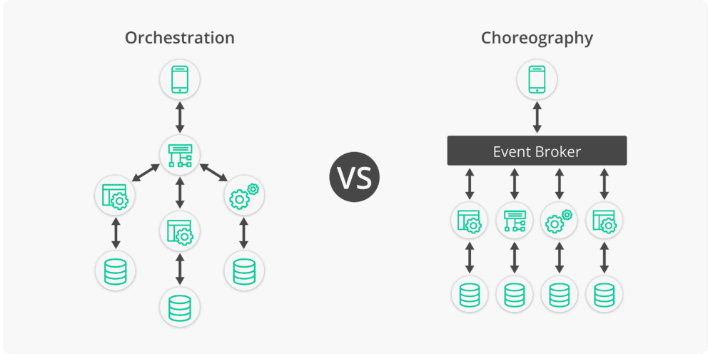 这里强烈推荐一篇博客文章, Microservices Choreography vs Orchestration: The Benefits of Choreography在新窗口打开,作者 Jonathan Schabowsky ,Solace 的 CTO。他在这边博客中总结了让微服务协同工作的两种模式,并做了一个生动的比喻: