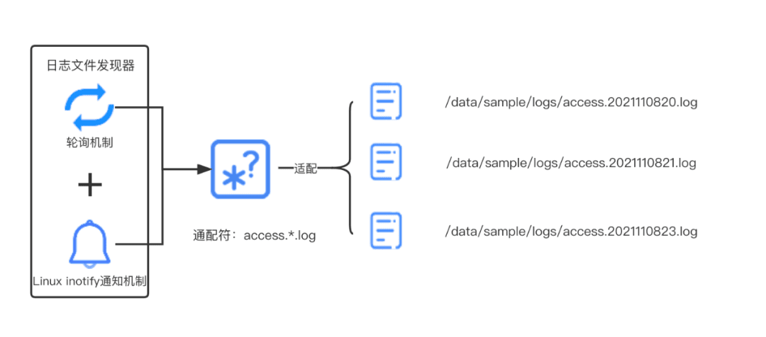 }综合以上思考,日志文件的发现和日志内容变更的监听,我们使用的是"inotify机制为主+轮询机制兜底"、"通配符"的设计方案,如下图所示: