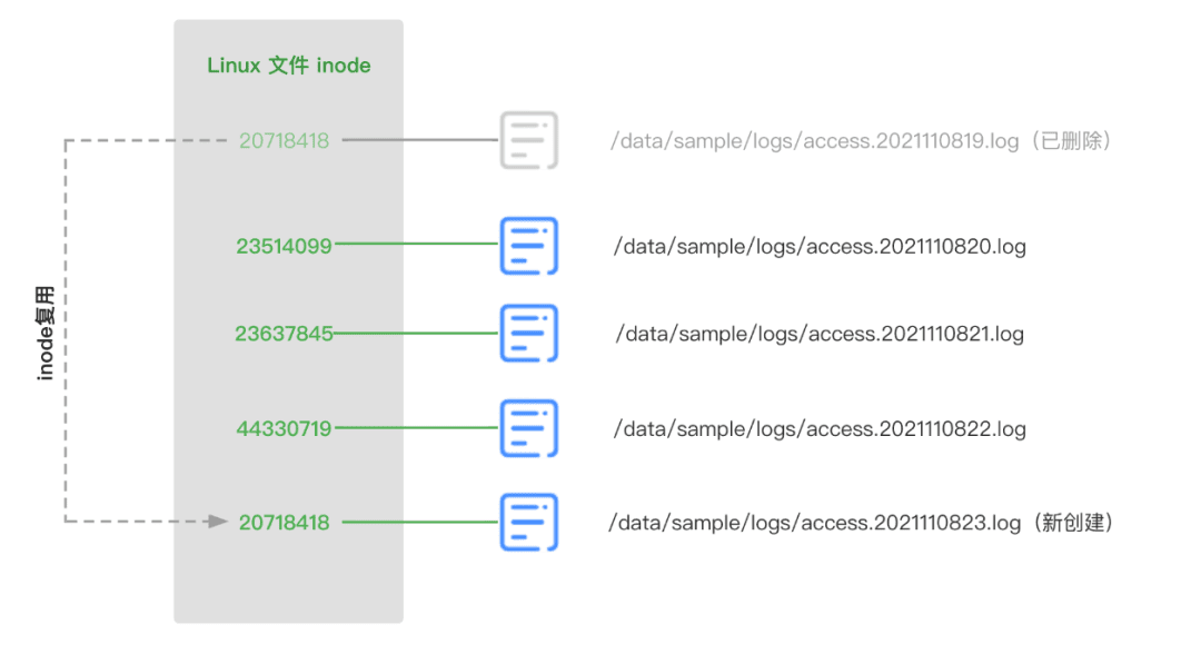 62651787 access.log一般来说,使用系统的inode号作为标识,已经能满足大多数的情况了,但是为了更严谨的考虑,还可以进一步升级方案。因为Linux 的inode号存在复用的情况,这里的"复用"要和"重复"区别一下,在一台机器上的所有文件不会同一时刻出现重复的两个inode号,但是当文件删除后,另一个新文件创建时,这个文件的inode号是可能复用之前删除文件的inode号的,代码逻辑处理不好,很可能造成日志文件漏采集,这一点是要注意的。为了规避这个问题,我们把文件的唯一标识设计为" 文件inode与文件签名组合",这里的文件签名使用的是该文件内容前128字节的Hash值,代码参考如下: