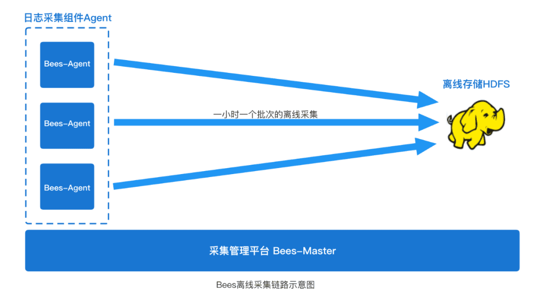 除了上面常见的实时日志采集的场景外(一般是日志采集到kafka这类消息中间件),Bees采集还有一个离线日志采集的场景。所谓离线日志采集,一般是指把日志文件是采集到HDFS下(参考下图)。