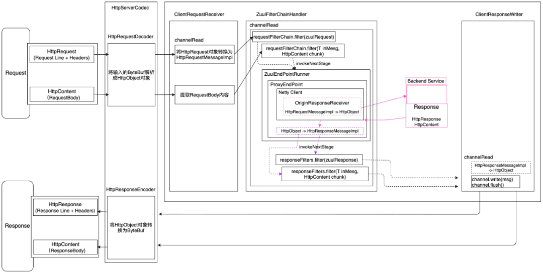 如上图所示,Netty自带的HttpServerCodec会将网络二进制流转换为Netty的HttpRequest对象,再通过ClientRequestReceiver编解码器将HttpRequest转换为Zuul的请求对象HttpRequestMessageImpl;