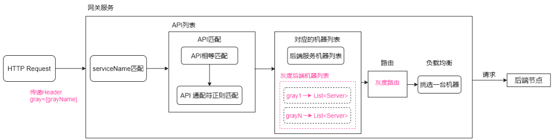 网关管理后台配置灰度路由的时候,会建立grayName -> List<Server>映射关系,当网关管理后台增量推送到网关服务之后,网关服务就可以通过grayName来提取配置下的后端机器列表,然后再进行负载均衡挑选机器。