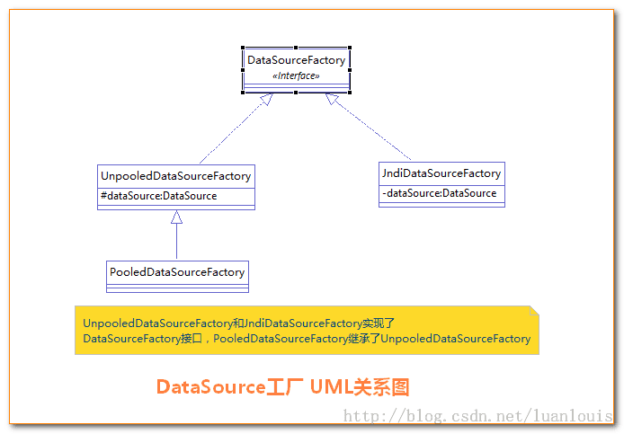 顺便说一下,MyBatis是通过工厂模式来创建数据源DataSource对象的,MyBatis定义了抽象的工厂接口:org.apache.ibatis.datasource.DataSourceFactory,通过其getDataSource()方法返回数据源DataSource:
