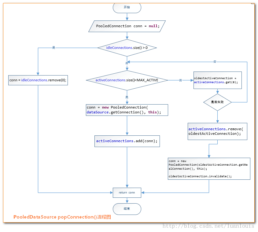 }从上述代码可以看到,当我们使用了pooledDataSource.getConnection()返回的Connection对象的close()方法时,不会调用真正Connection的close()方法,而是将此Connection对象放到连接池中。