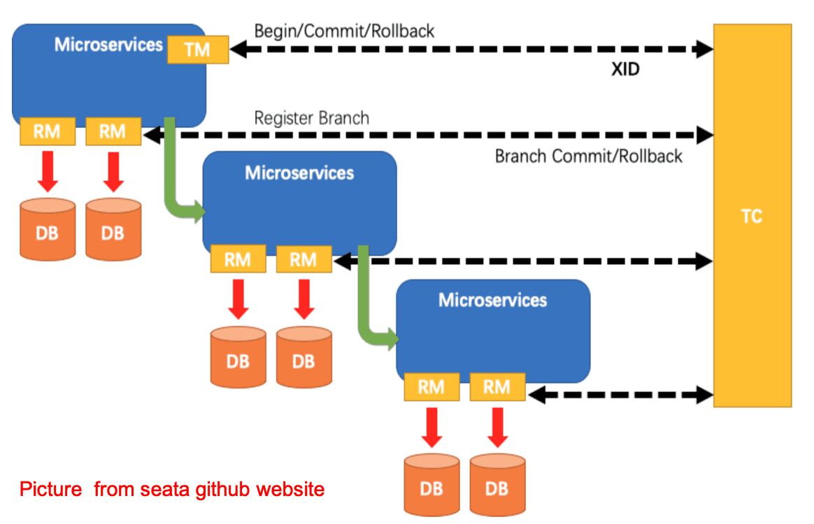 TM 控制全局事务的边界,TM 通过向 TC 发送 Begin 指令,获取全局事务 ID,所有分支事务通过此全局事务 ID,参与到全局事务中;全局事务 ID 的上下文存放在当前线程变量中。