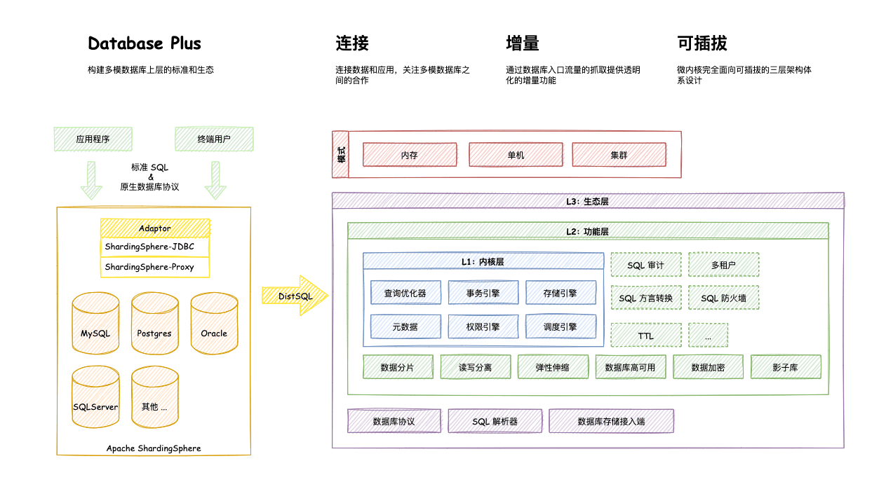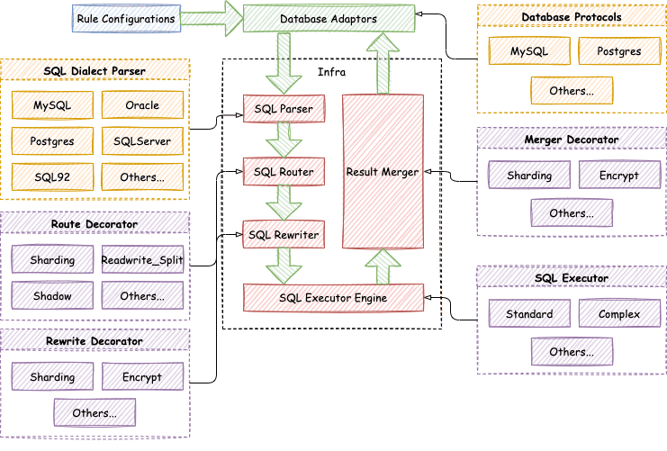 用于对接和融入现有数据库生态,包括数据库协议、SQL 解析器和存储适配器,分别对应于 Apache ShardingSphere 以数据库协议提供服务的方式、SQL 方言操作数据的方式以及对接存储节点的数据库类型。