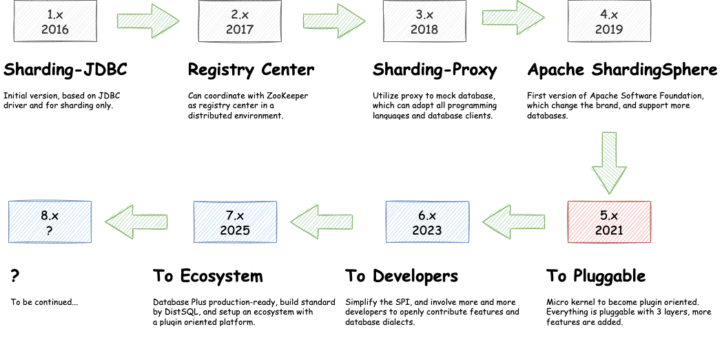 Apache ShardingSphere 5.x 版本开始致力于可插拔架构,项目的功能组件能够灵活的以可插拔的方式进行扩展。 目前,数据分片、读写分离、数据库高可用、数据加密、影子库压测等功能,以及对 MySQL、PostgreSQL、SQLServer、Oracle 等 SQL 与协议的支持,均通过插件的方式织入项目。 Apache ShardingSphere 目前已提供数十个 SPI 作为系统的扩展点,而且仍在不断增加中。