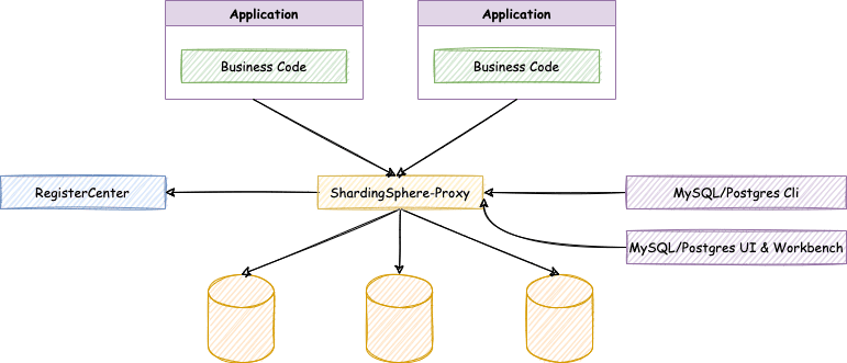 Apache ShardingSphere 是多接入端共同组成的生态圈。 通过混合使用 ShardingSphere-JDBC 和 ShardingSphere-Proxy,并采用同一注册中心统一配置分片策略,能够灵活的搭建适用于各种场景的应用系统,使得架构师更加自由地调整适合于当前业务的最佳系统架构。