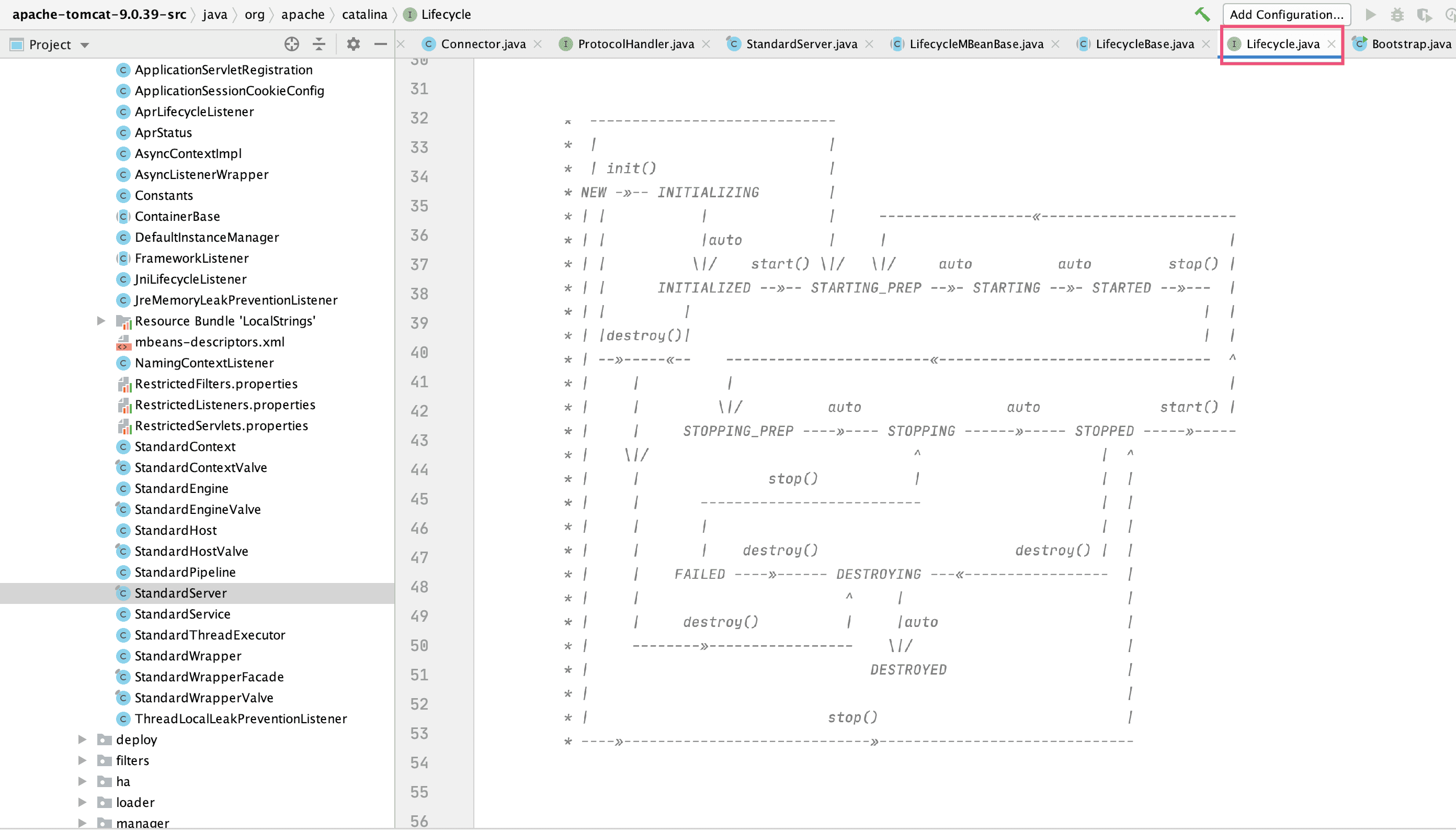 从上述源码看得出来,LifecycleBase是使用了状态机+模板模式来实现的。模板方法有下面这几个: