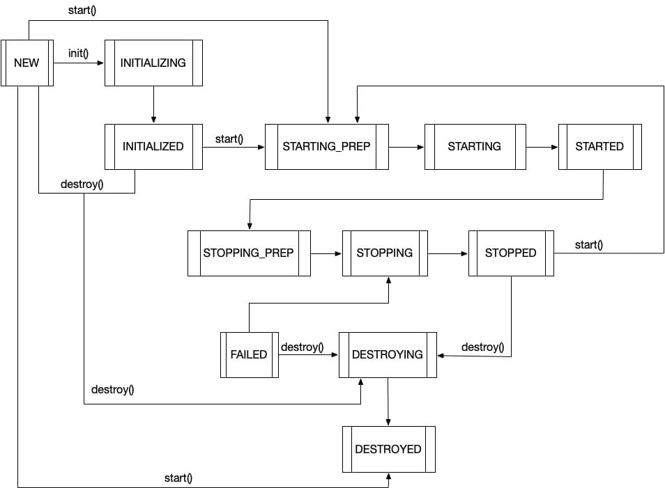 // 初始化的过程中,可能会有异常抛出,这时需要捕获异常,并将状态变更为`FAILED`